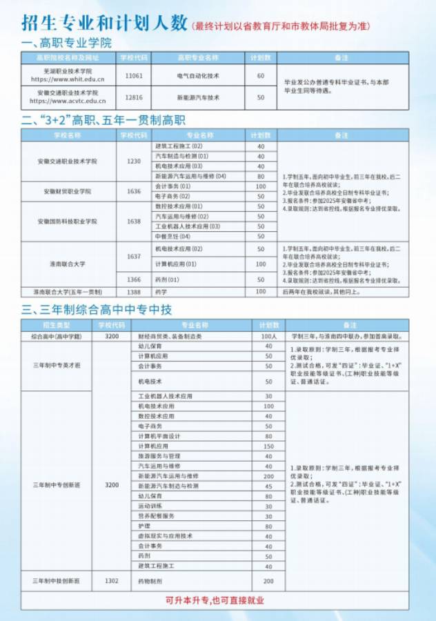 我们的学生既可以参加普通高考,也可以通过对口高考、分类考试、直升高职、“3+3”、“5+2”等方式进入全日制专科或本科院校就读,也可以参加天津职业技术师范大学单独升本招生考试。招生计划教育部批准,录取院校均为全日制高等院校,录取后在校待遇、毕业证书、就业政策均与普通高考学生相同。